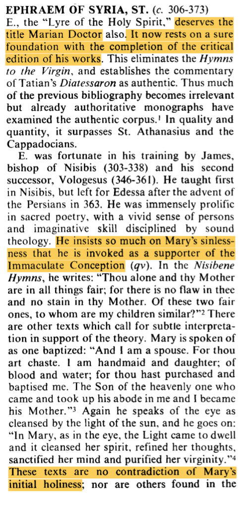 Nous constatons donc que, selon O’Carroll, saint Éphrem est, je cite : « invoqué comme un défenseur de l’Immaculée Conception ».